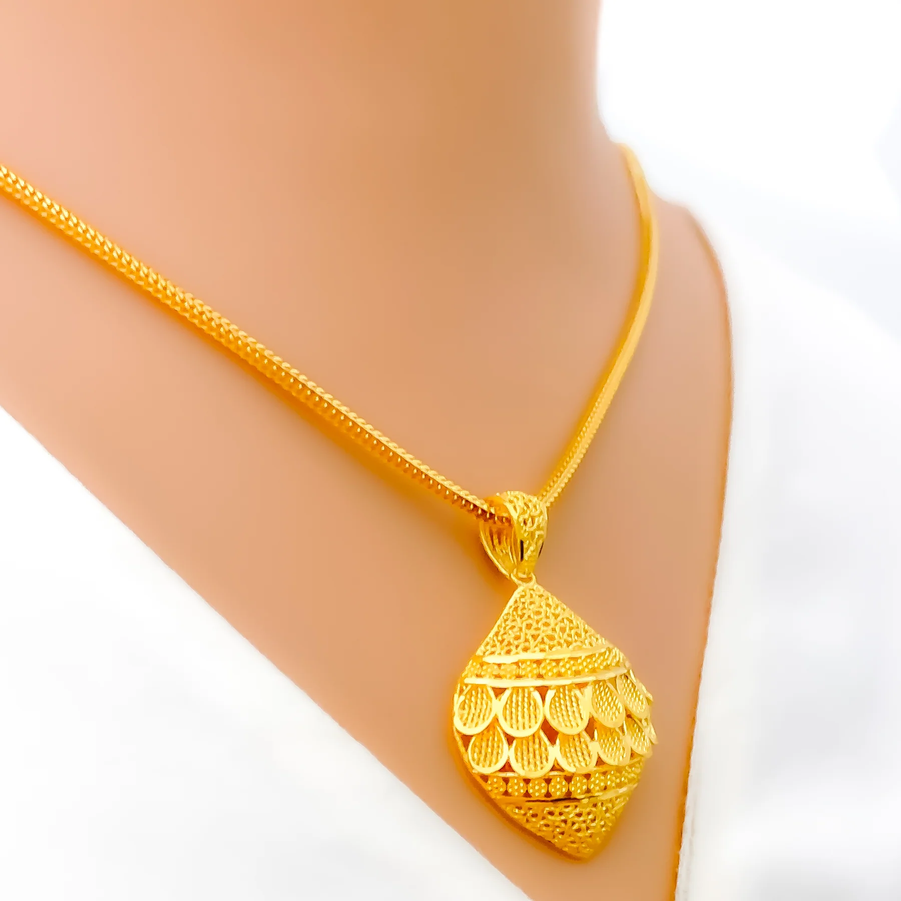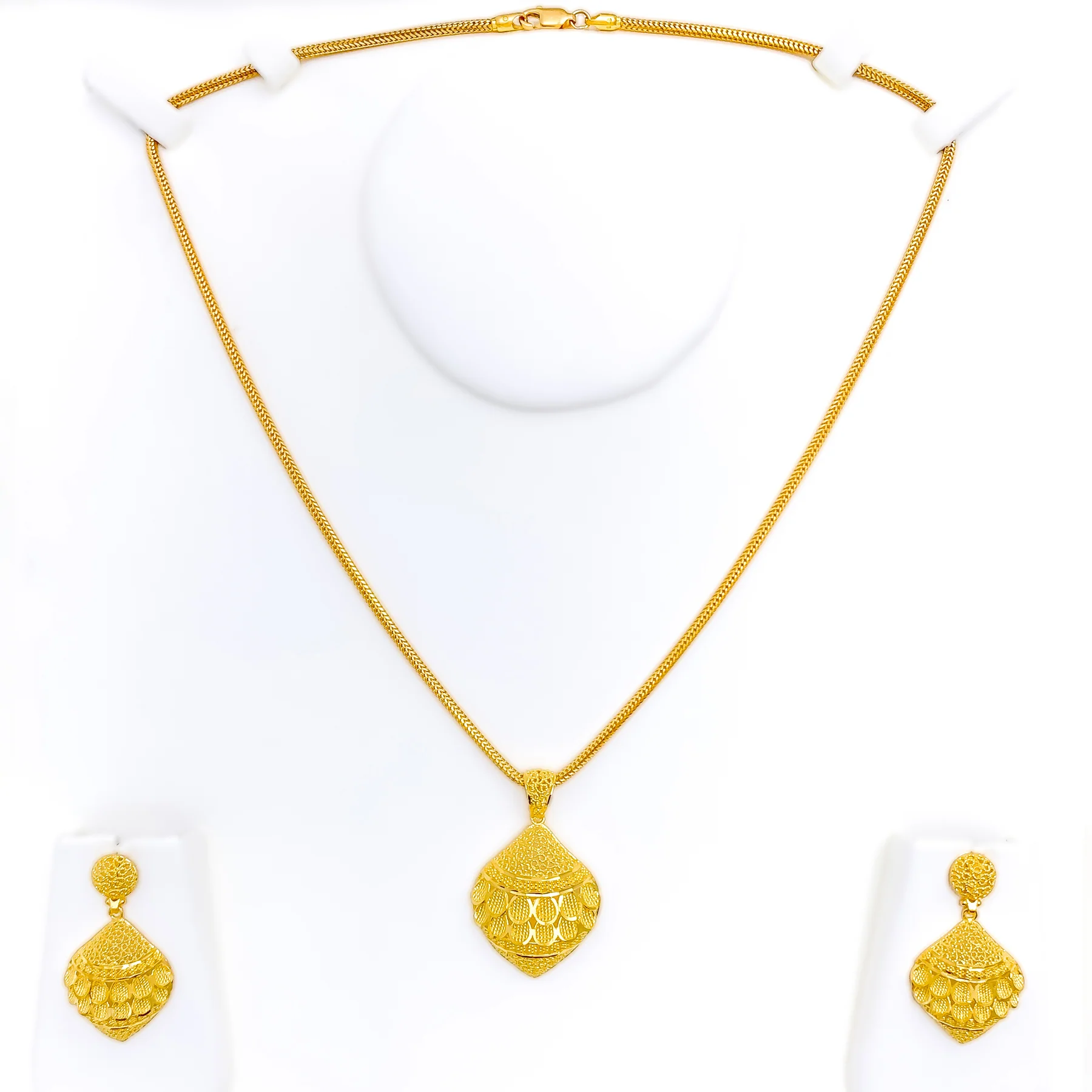 This pendant set is meticulously crafted from 22k gold with a total weight of 11.3 grams, showcasing a lustrous yellow gold finish. The set includes a pendant that is 1.5 inches in length, along with matching earrings that are each 1.3 inches long. The earrings come with the option of screw or push back posts, offering a secure and comfortable fit. This three-piece set does not include a chain, providing the freedom to pair it with a chain of your choice. Ideal for those who seek a shimmering and elegant accessory, this gold set is perfect for adding a touch of glamour and sophistication to any ensemble.