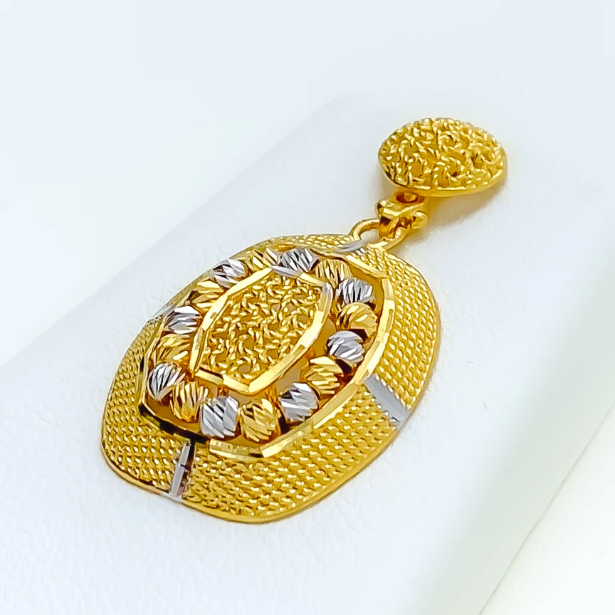 This pendant set is crafted in 22k gold, weighing 13.5 grams, and features a stylish two-tone finish of yellow and white gold. The pendant length is 1.5 inches, complemented by matching earrings that measure 1.3 inches each. The earrings are designed with versatile screw or push back posts for secure and comfortable wear. This set includes three pieces but does not come with a chain, offering the flexibility to pair it with any chain of your choice. Ideal for those who appreciate the beauty of mixed metals, this set provides a chic and coordinated look perfect for enhancing any sophisticated ensemble.