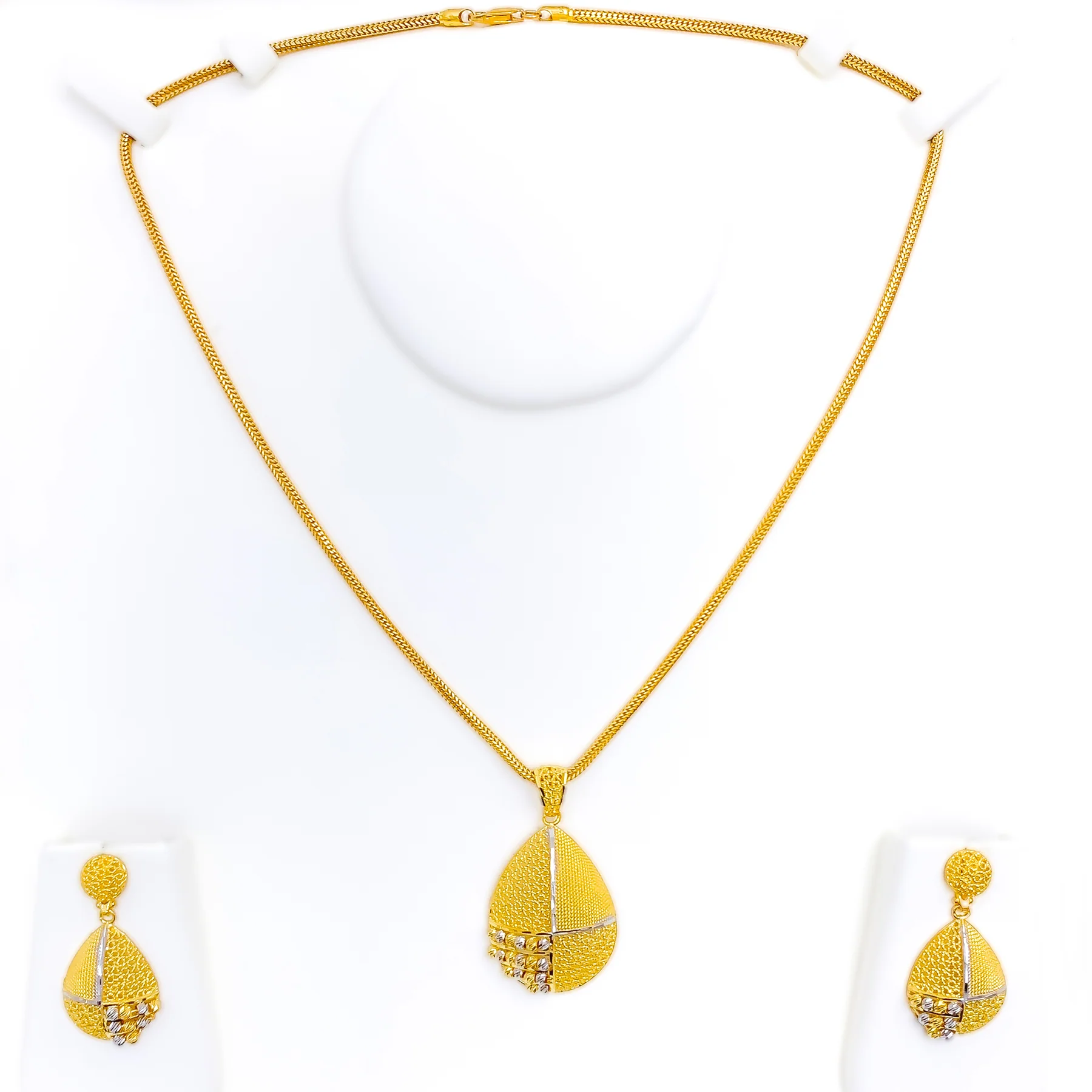 This two-tone pendant set in 22k gold weighs 12.4 grams and features a blend of yellow and white gold finishes, adding a unique aesthetic appeal. The set includes a pendant, measuring 1.6 inches in length, and matching earrings, each 1.4 inches long. The earrings are designed with the choice of screw or push back posts, catering to comfort and security. This three-piece set does not include a chain, allowing for versatile styling options. Ideal for those who love coordinated jewelry, this set offers a stylish and sophisticated look perfect for enhancing any outfit.